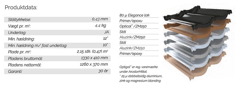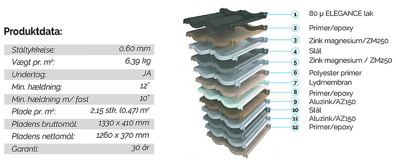 Produktet er udviklet med det klassiske tegldesign. Den specielle aluzinkbelægning giver en uovertruffen holdbarhed. Tagpladerne er produceret af galvaniseret stål og aluzink som gør de miljø venlige plader næsten 100 % genanvendelige.